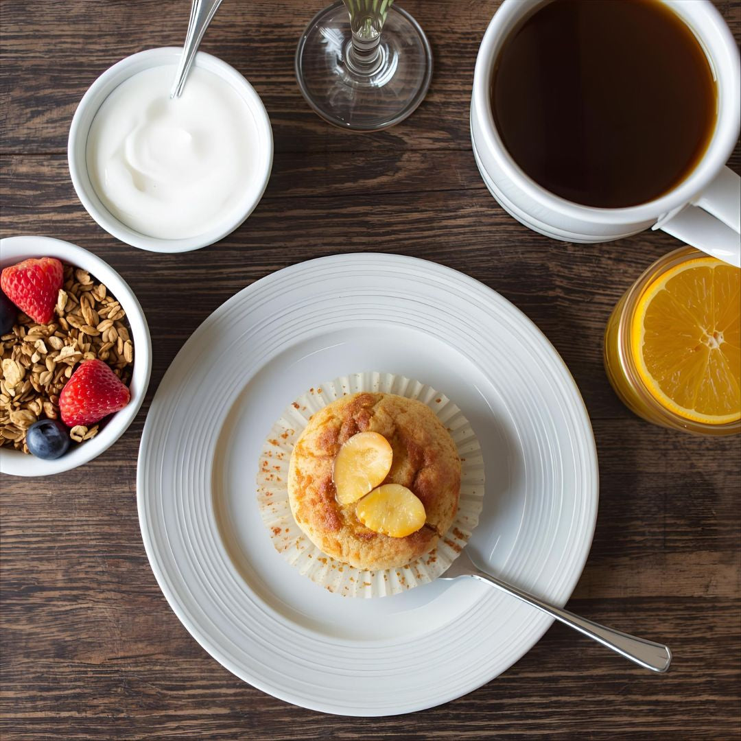 Ham, Cheddar, and Roasted Tomato Savory Muffin, Coffee Cake, Yogurt and Granola, Seasonal Fresh Fruit